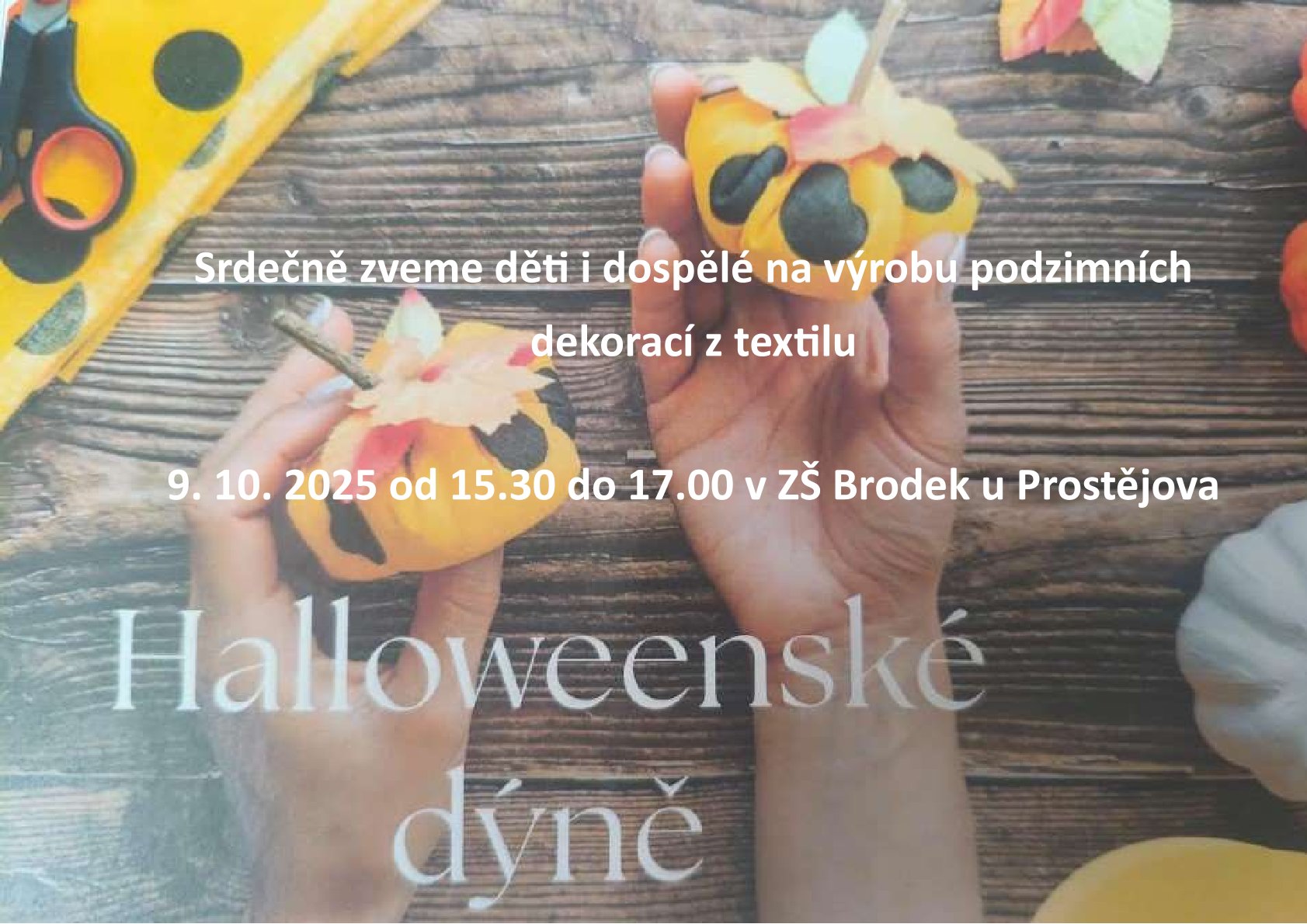 Výroba textilních podzimních dekorací se koná 9. 10. 2025 od 15.30 do 17. 00 v učebně výtvarné výchovy.