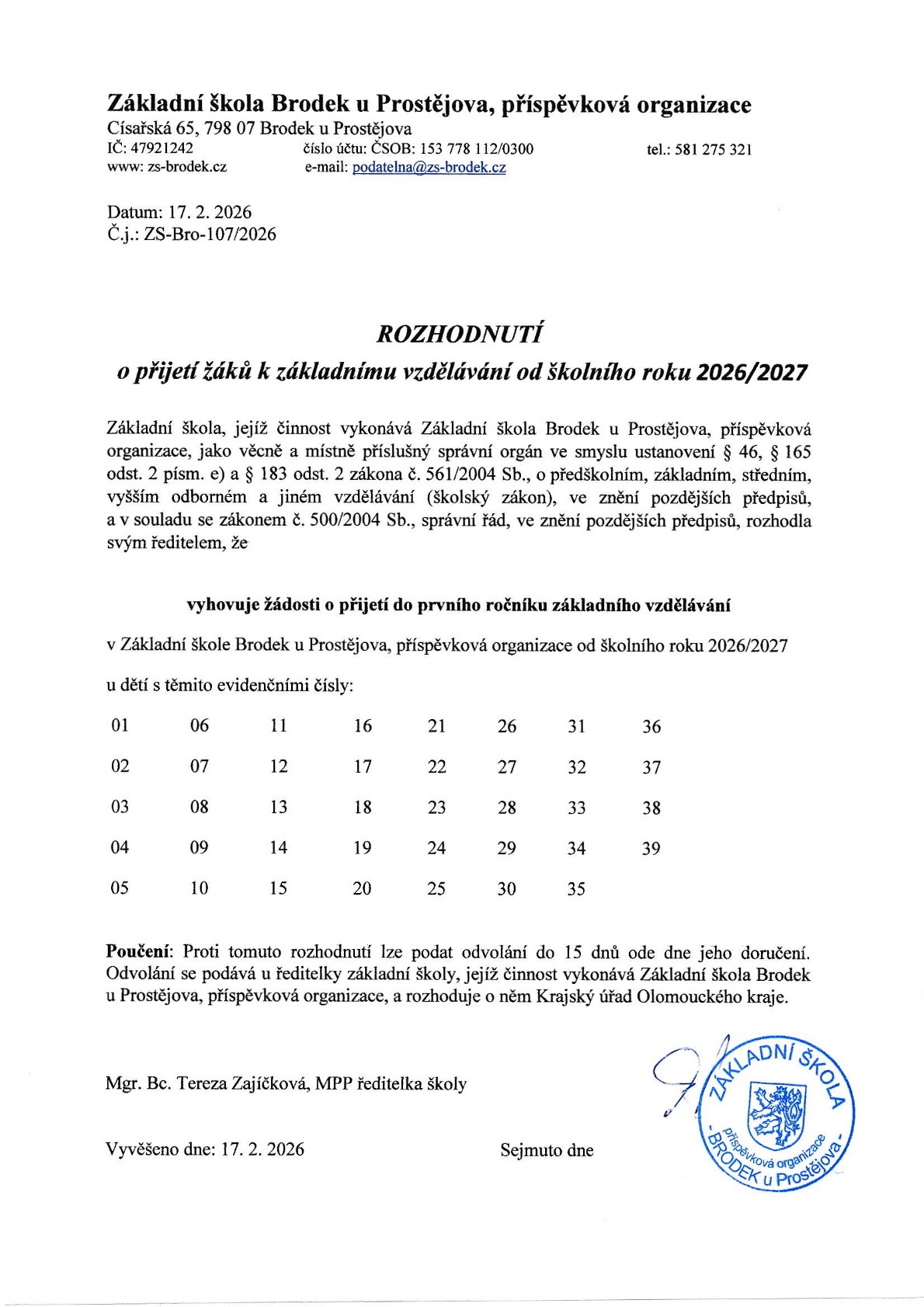 Písemné rozhodnutí si můžete vyzvednout od 21. 2. 2026 v kanceláři školy.